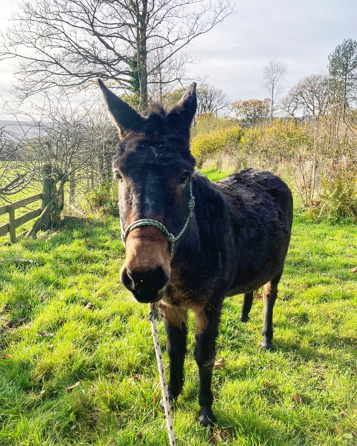 A donkey poses for a photo out in a field during springtime